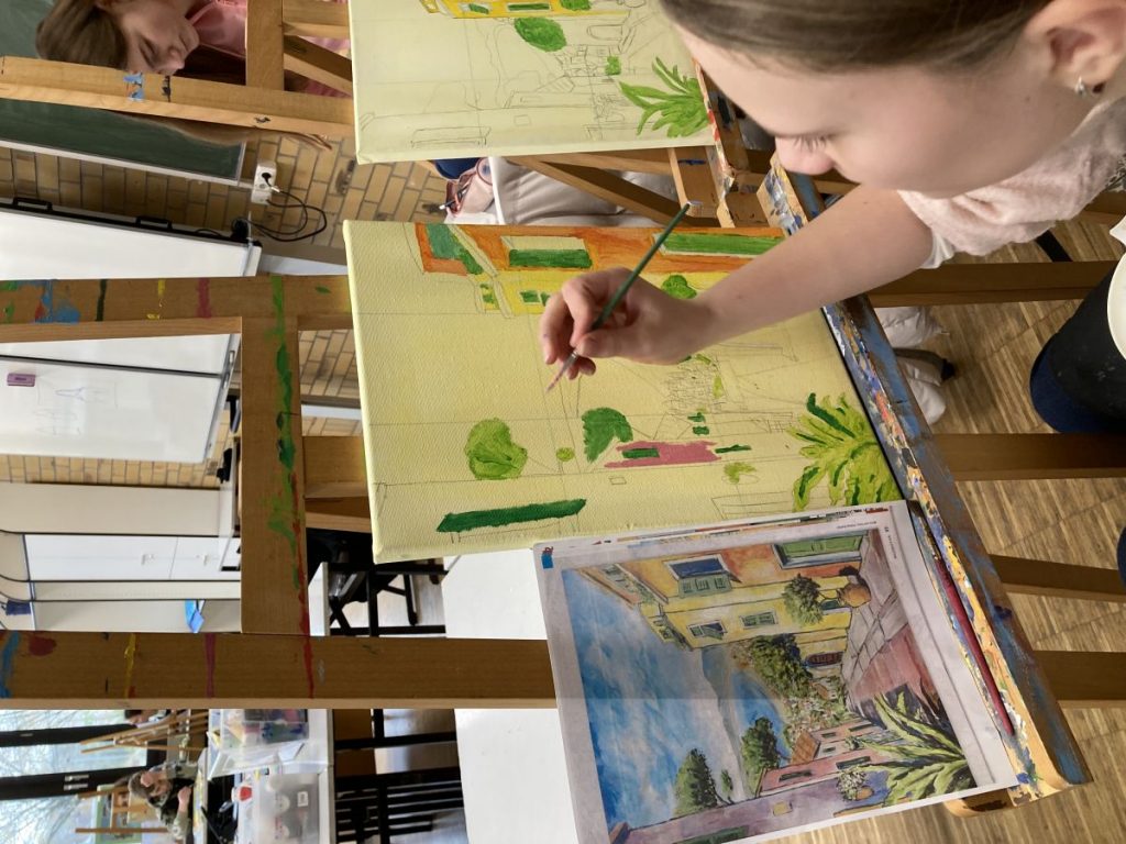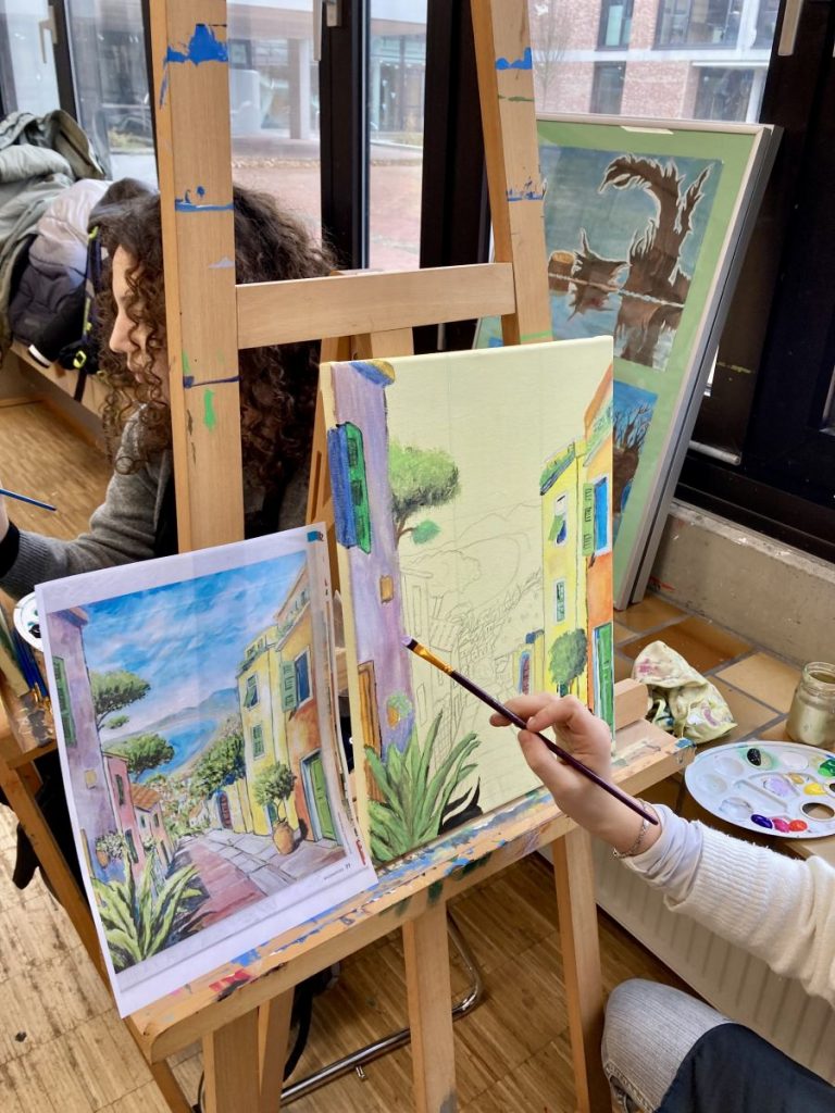 und richteten ihren Arbeitsplatz ein (Staffeleien, Leinwand, Farben, Pinsel, Paletten, Schürzen) – Anweisungen wurden überflüssig, jeder wusste genau, was er zu tun hatte.
