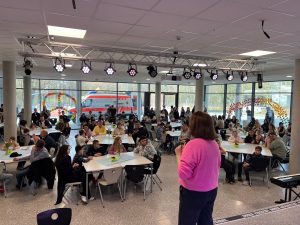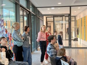 Schon kurz vor 15 Uhr kamen die ersten Gäste, Familien, Eltern, Omas und Opas mit ihren Kindern und Enkeln zur Tür herein. Neugierige Blicke schauten rechts und links und wollten schon losstürmen, als Frau Zerhusen zum gemeinsamen Beginn in die Mensa bat. Um 15:10 Uhr begrüßte unsere Schulleitung in der gut gefüllten Aula die kleinen und großen Gäste aus den Grundschulen Belm, Powe, Icker und Vehrte und freute sich sichtlich über das große Interesse und die vielen Gesichter. Herr Ringling und Frau Alberts stellten noch kurz das Programm des Tages vor und dann konnte es losgehen.