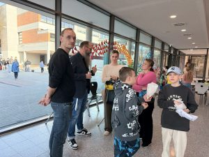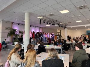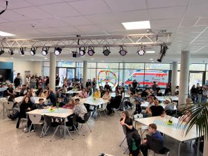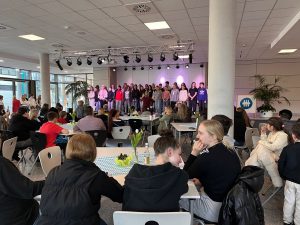 Den ganzen Morgen wurde vorbereitet, Fenster dekoriert, Tische geschleppt und Ausstellungen platziert. Das Würstchenmobil fuhr vor, der Förderverein schmiss die Waffeleisen an und die Popcornmaschine versprühte einen Caramelduft in der Schule. Unsere Technik-AG löste letzte WLAN-Probleme am Mischpult und die Sonne strahlte über der Oberschule Belm, als wüsste sie schon, was passieren sollte …: ein herrlicher Tag der offnen Tür bahnte sich an.