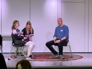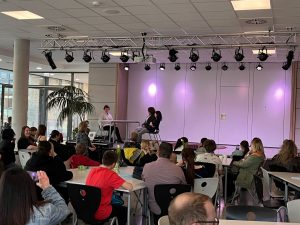 Zum Abschluss stellten Schüler*innen auf der Bühne in vorbereiteten Interviews unseren Gästen ein paar Lehrer*innen und Kolleg*innen vor – eine tolle Idee, Gesichter mit Namen zu verbinden. Und auch für uns Kollegen war es spannend zu erfahren, wer da lieber Cola als Pepsi trinkt und wer eigentlich Lokomotivführer werden wollte.