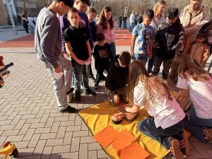 Unsere Klassenräume wurden zu Experiment-Laboren und Mitmachspielen. Liebevoll vorbereitete Interviews und sportliche Spiele forderten die Viertklässler und ihre Geschwister im Gebäude und auf dem Schulhof, der mit seinem Fußball- und Basketballfeld von unseren Lehrerinnen und Lehrern ebenso zur Attraktion gestaltet wurde wie die Kletterspinne. Die Sanitäter-AG zeigte ihr Können und Wirken gemeinsam mit einem extra angereisten Einsatzfahrzeug und ließ an den Reanimations-Puppen selbst lebensrettende Maßnahmen üben.