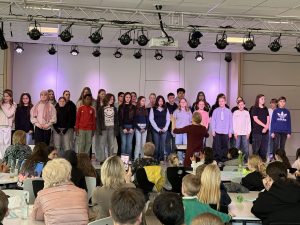 Um 16 Uhr präsentierten sich unsere Schauspieler und Musiker auf der Bühne und führten Sketche unter der Leitung von Frau Fergurson professionell und kurzweilig auf. Die Tontechnik-AG um Hanno Eulefeld gab alles, um die Stimmen über die Deckenmikros einzufangen. Kurz darauf füllte sich die Bühne und unser Schulchor gab mit Frau Fergurson am Klavier und Frau Koppelmann am Taktstock zwei Songs zum Besten. Ein großes Kompliment an unsere musikalischen, schauspielerischen und technischen Talente.