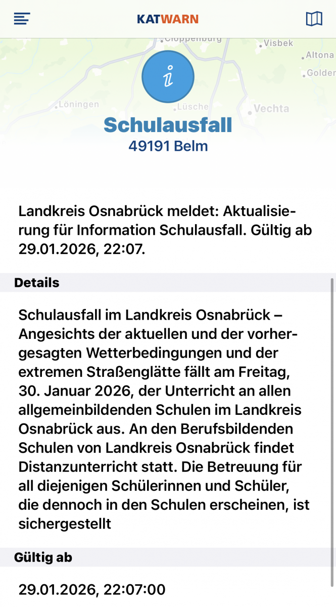 Und da haben wir den Salat. KATWARN meldet gerade, dass am 30.1. erneut die Schule im Landkreis Osnabrück ausfällt.